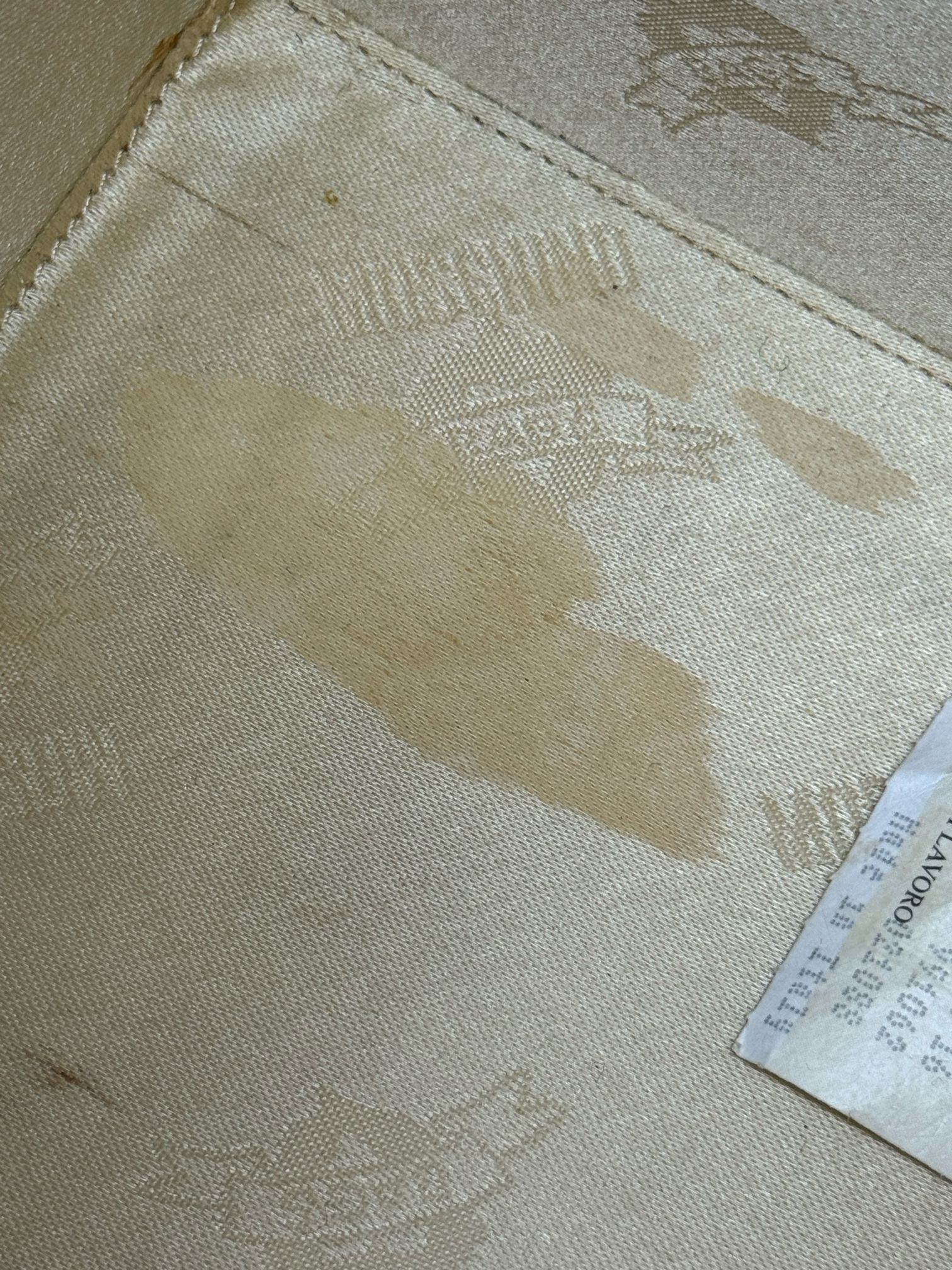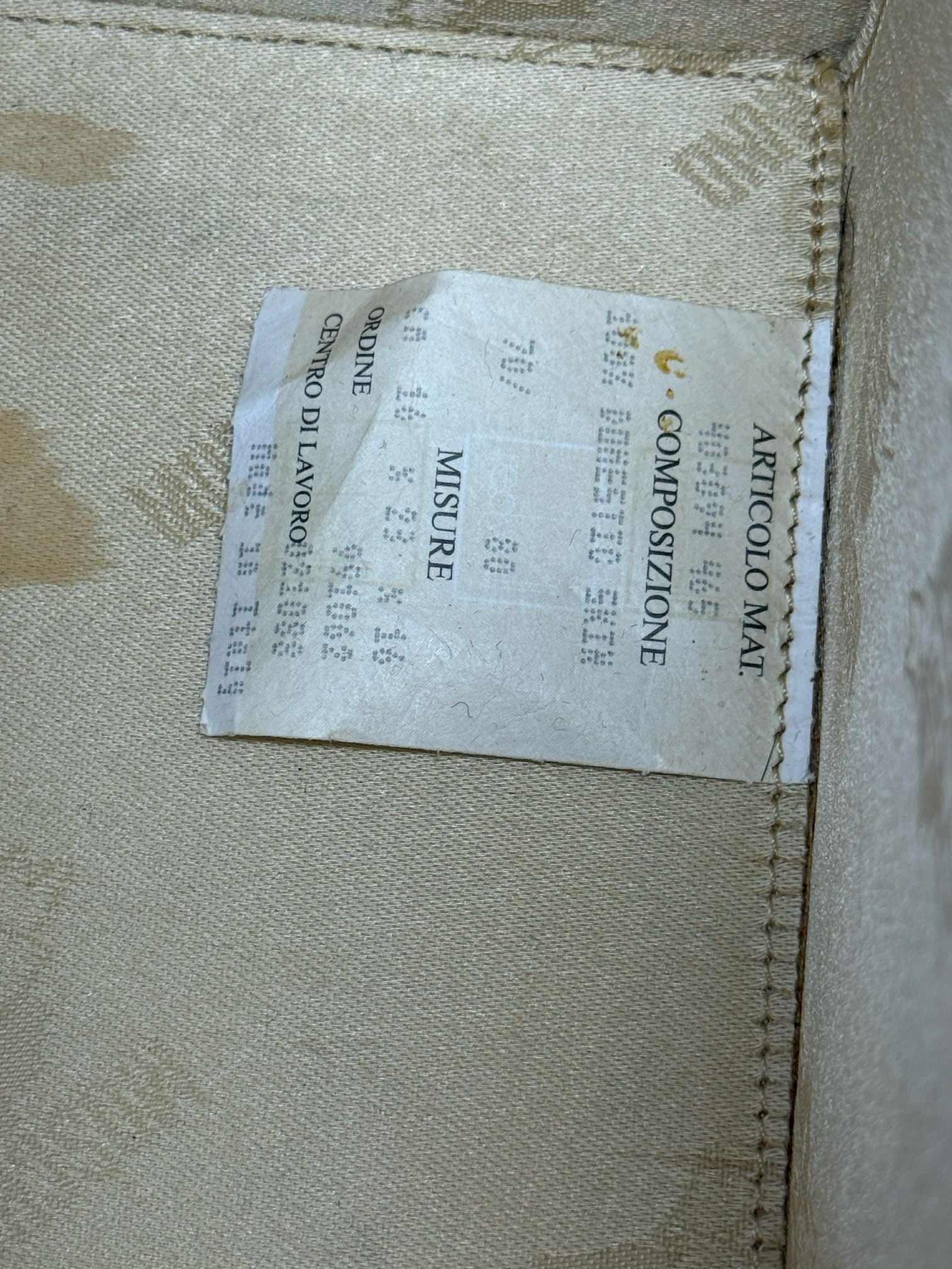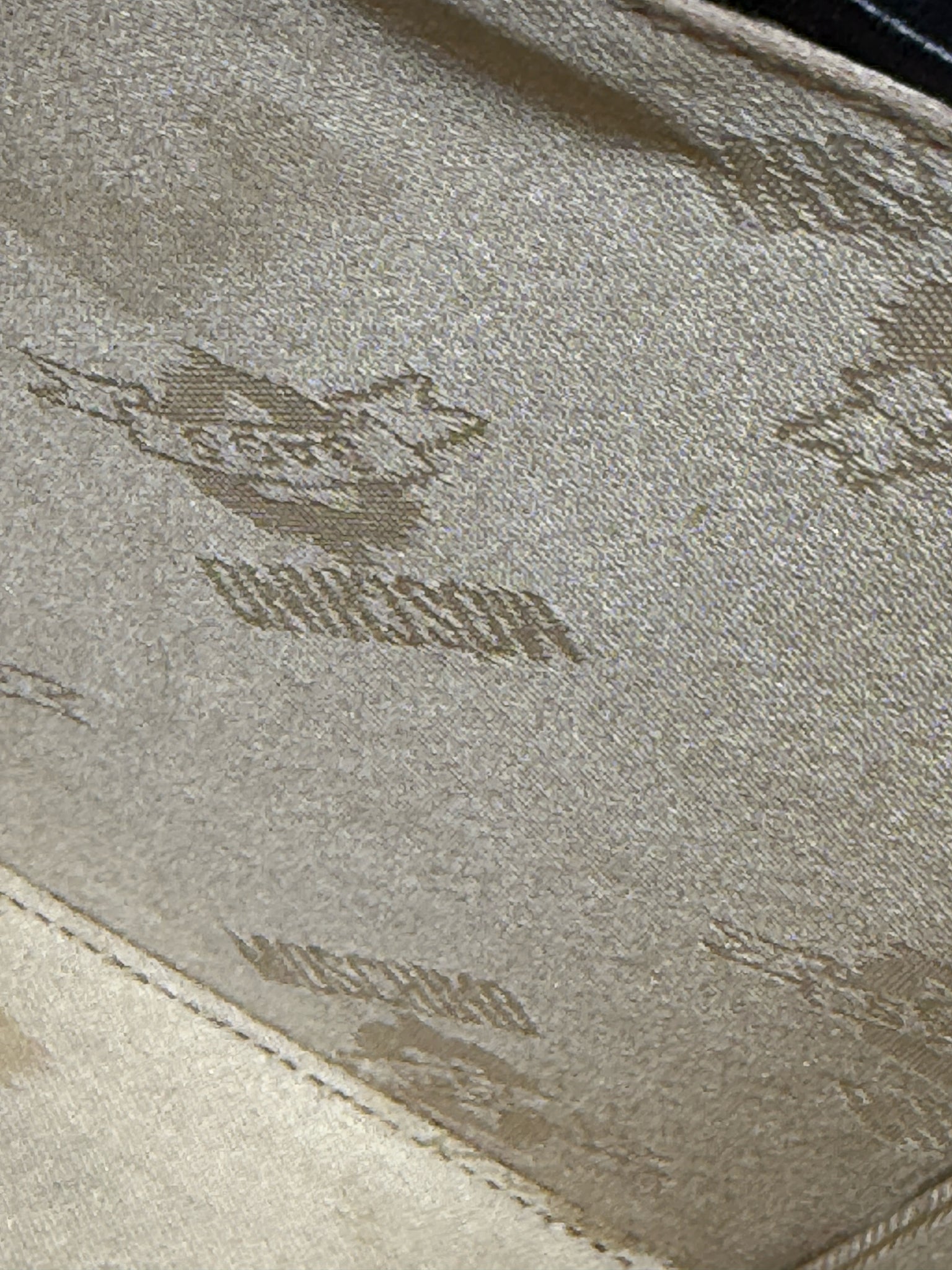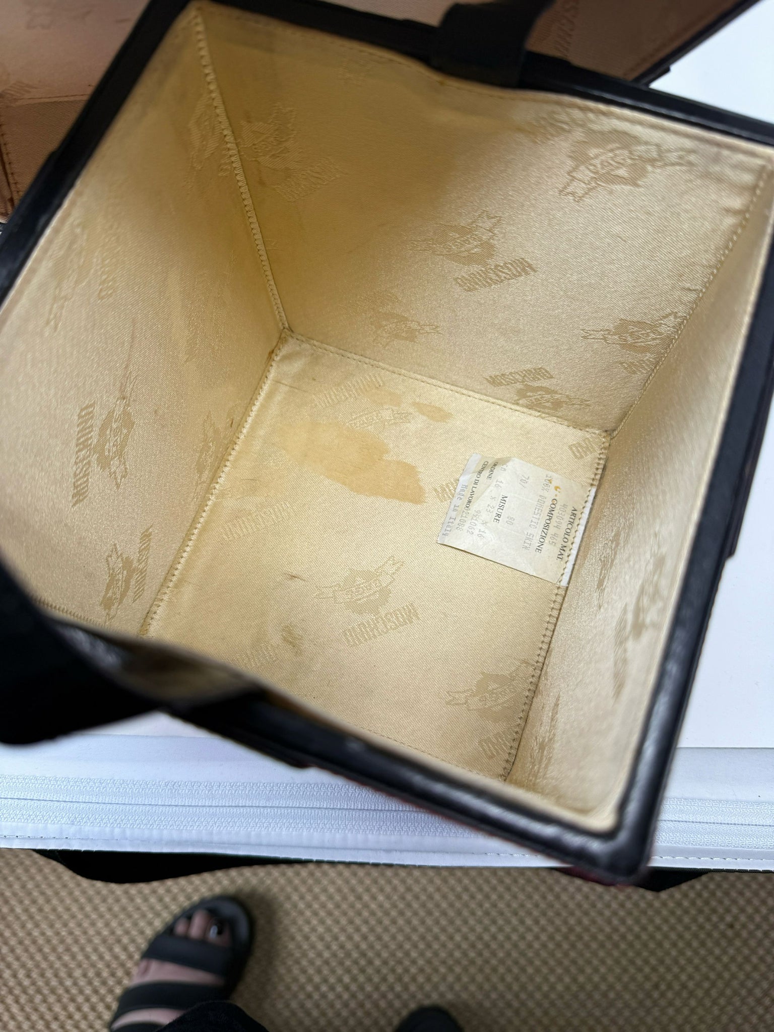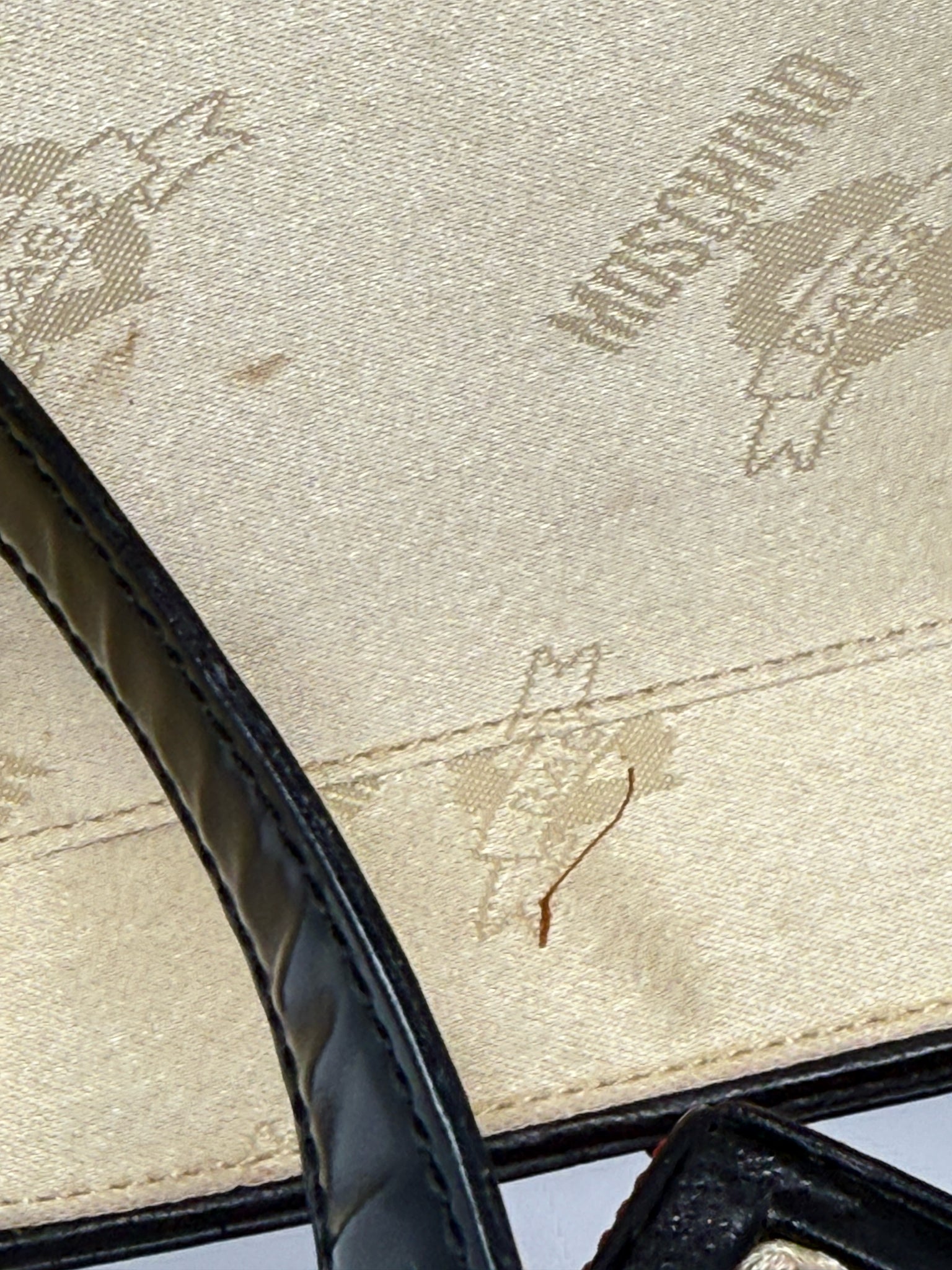 Slight imperfections in the leather with some discoloration on outside, a few scratches and staining on inside lining. Bends in the leather strap.