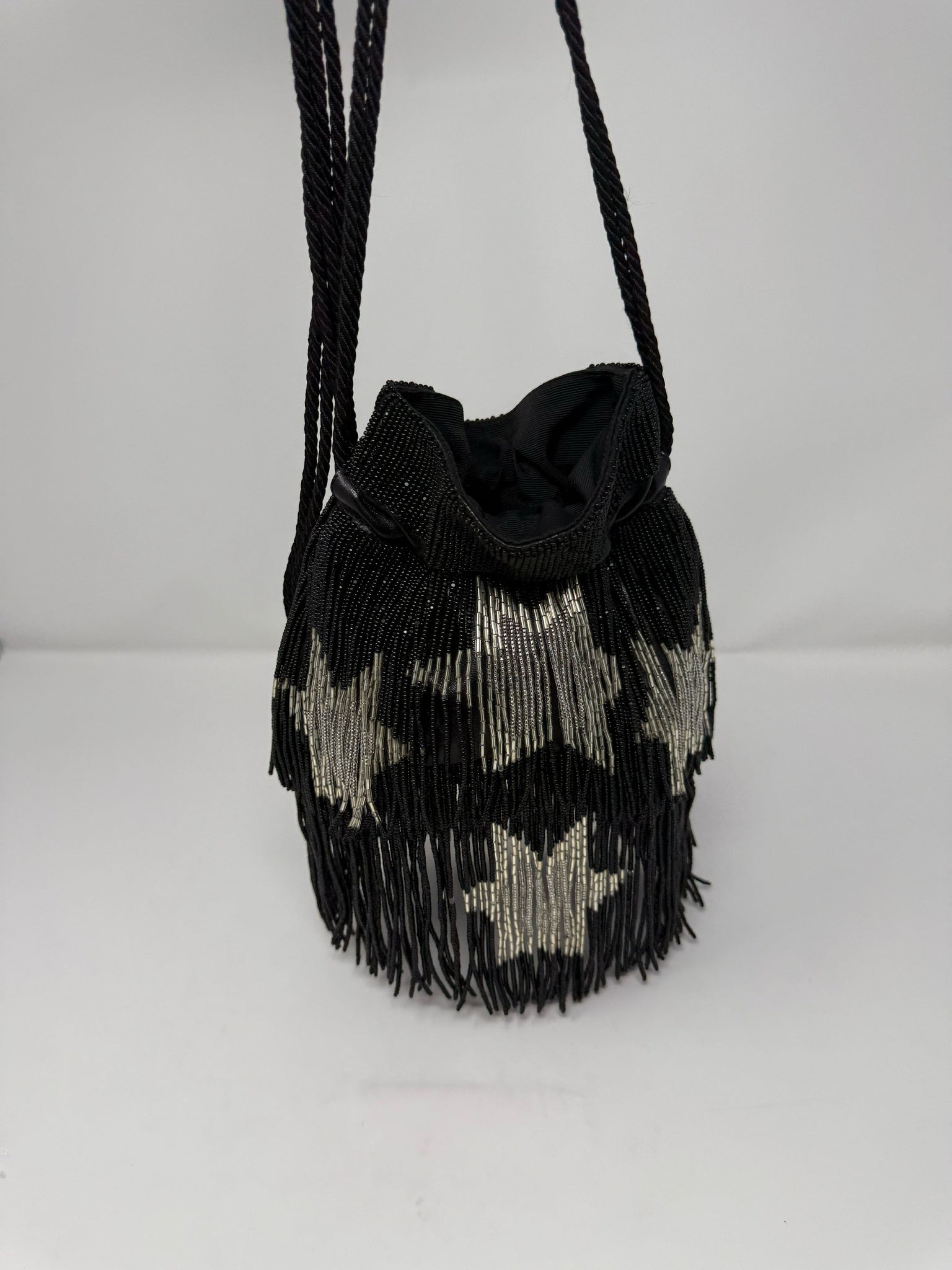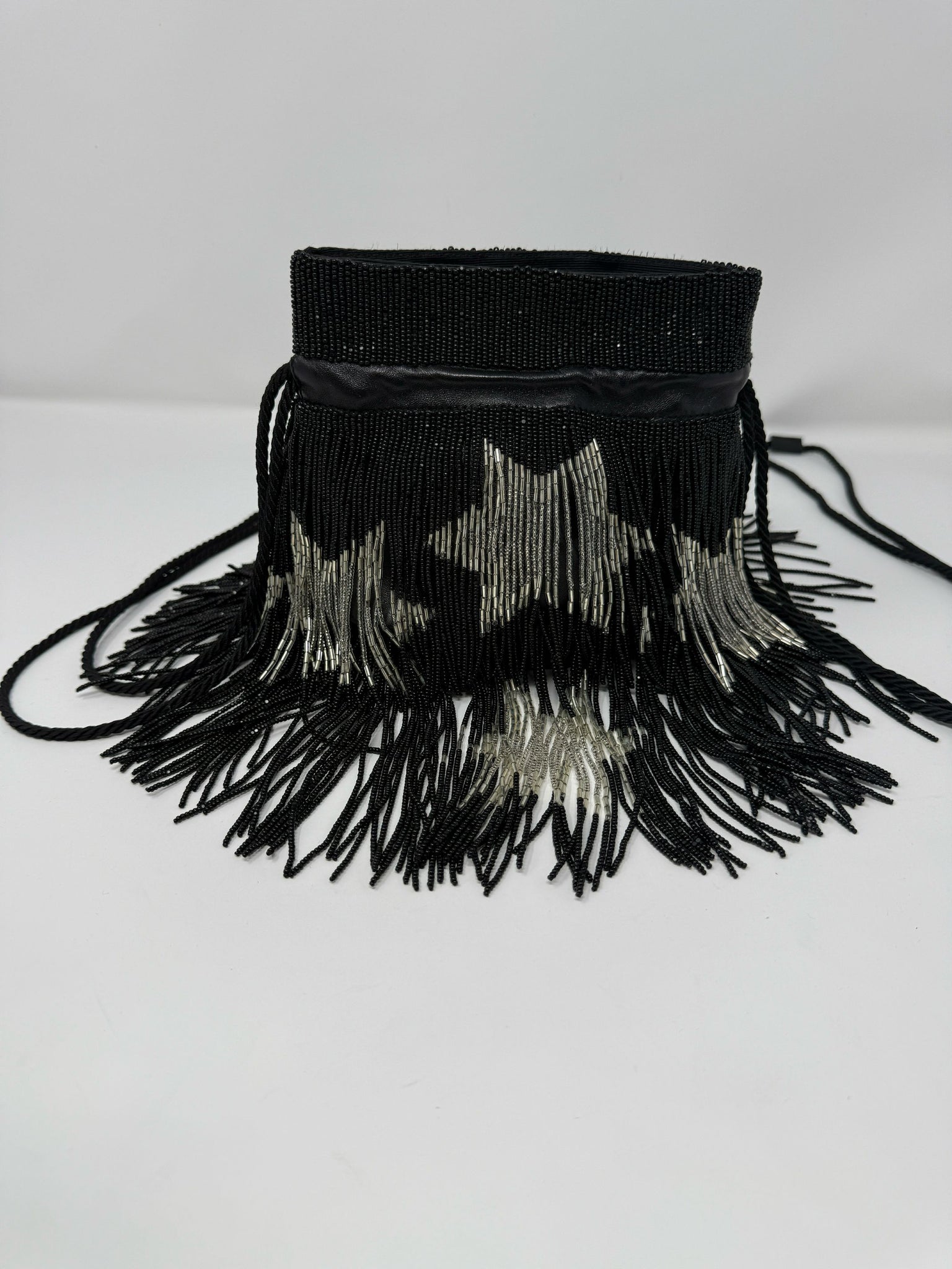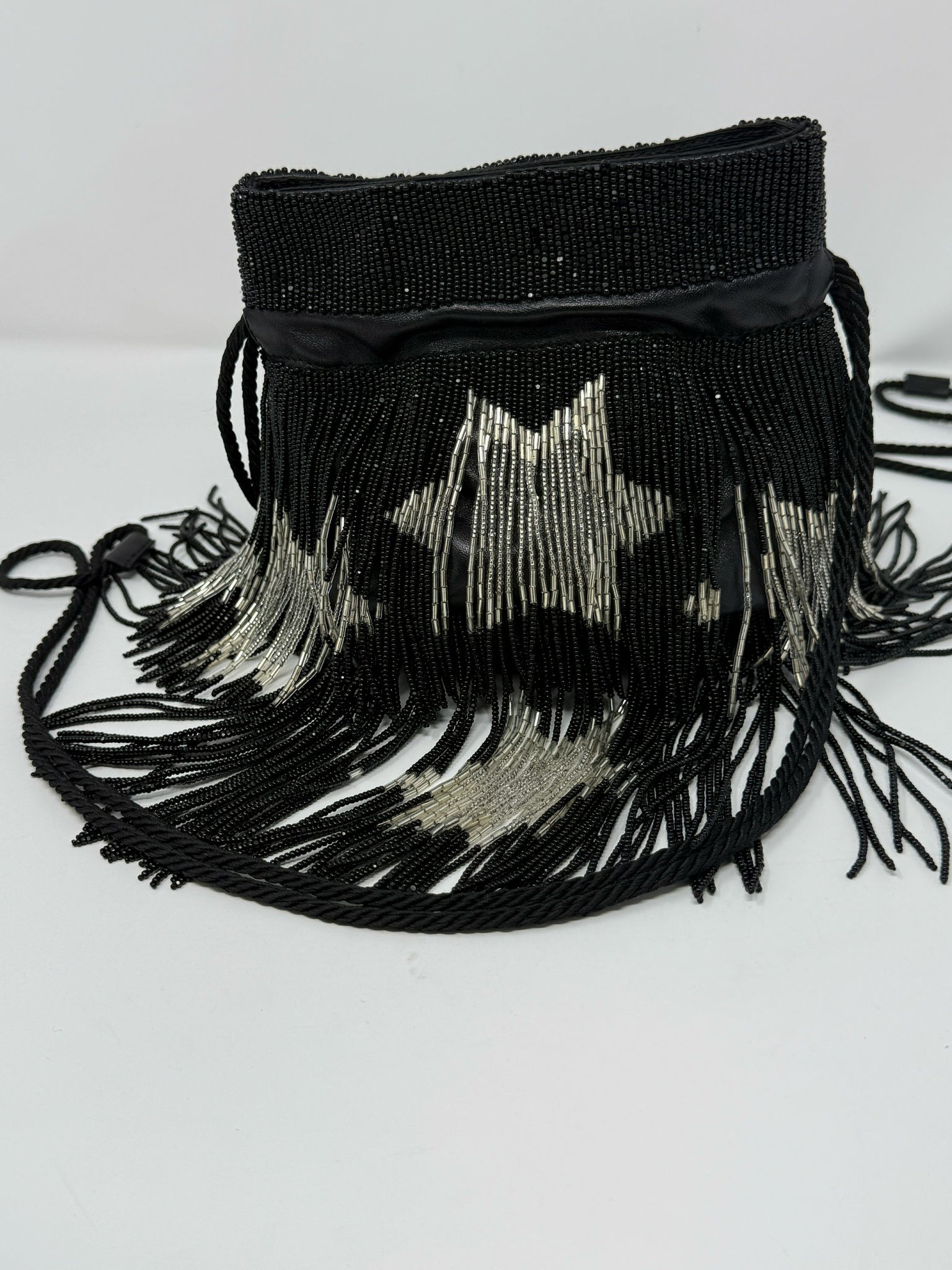 Saint Laurent Black Leather and beaded bucket style evening bag with unique star design and draw string closure. No Dust bag.