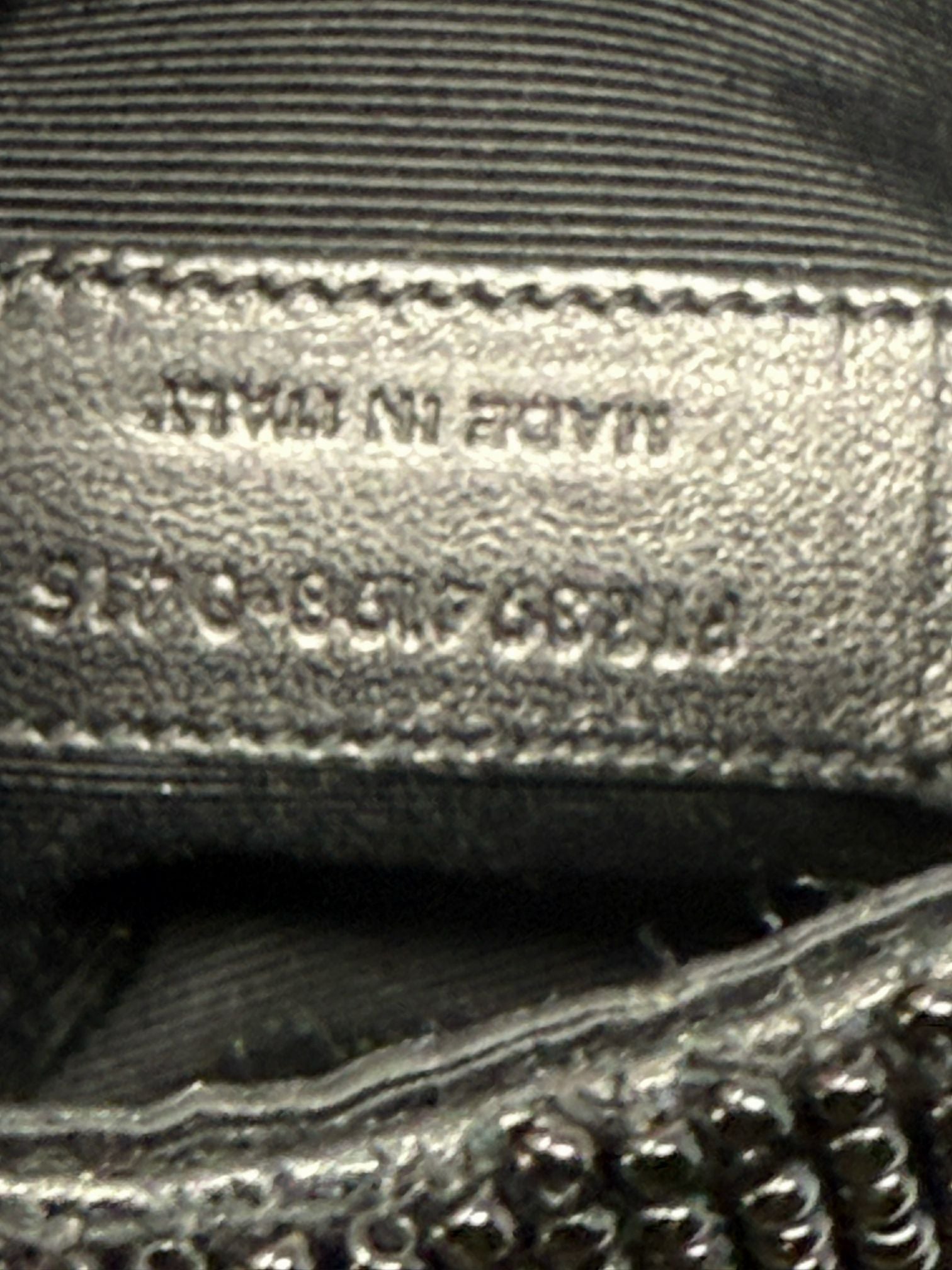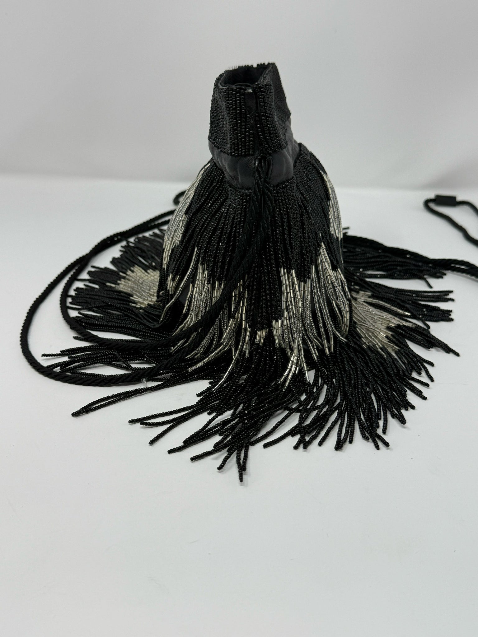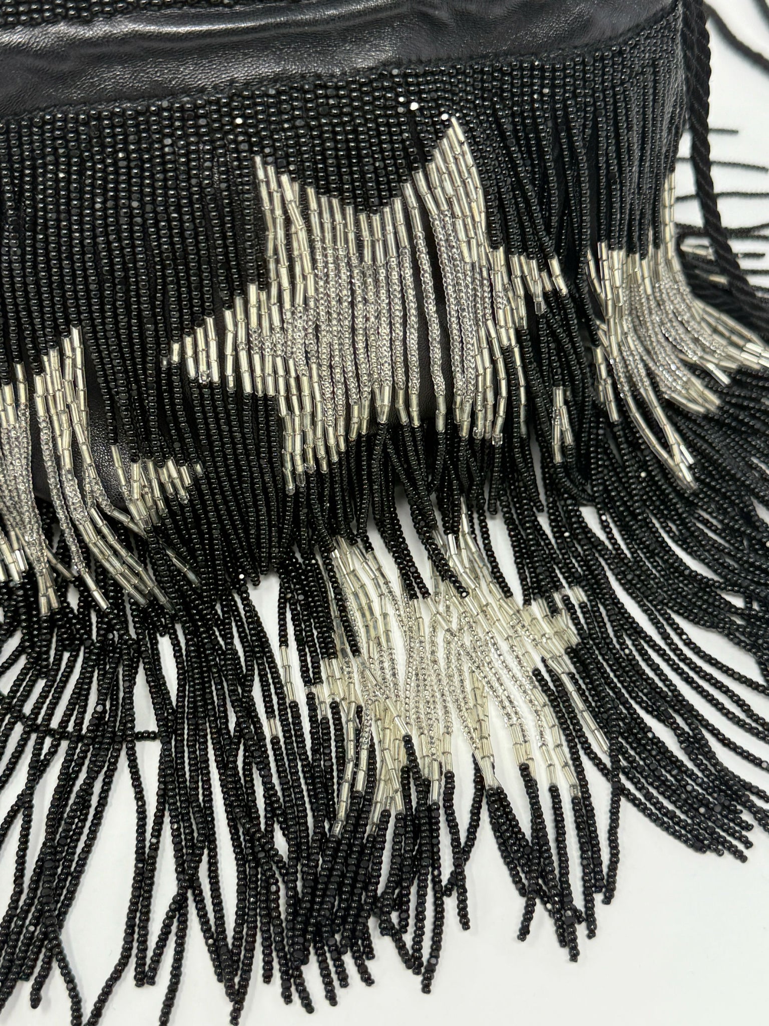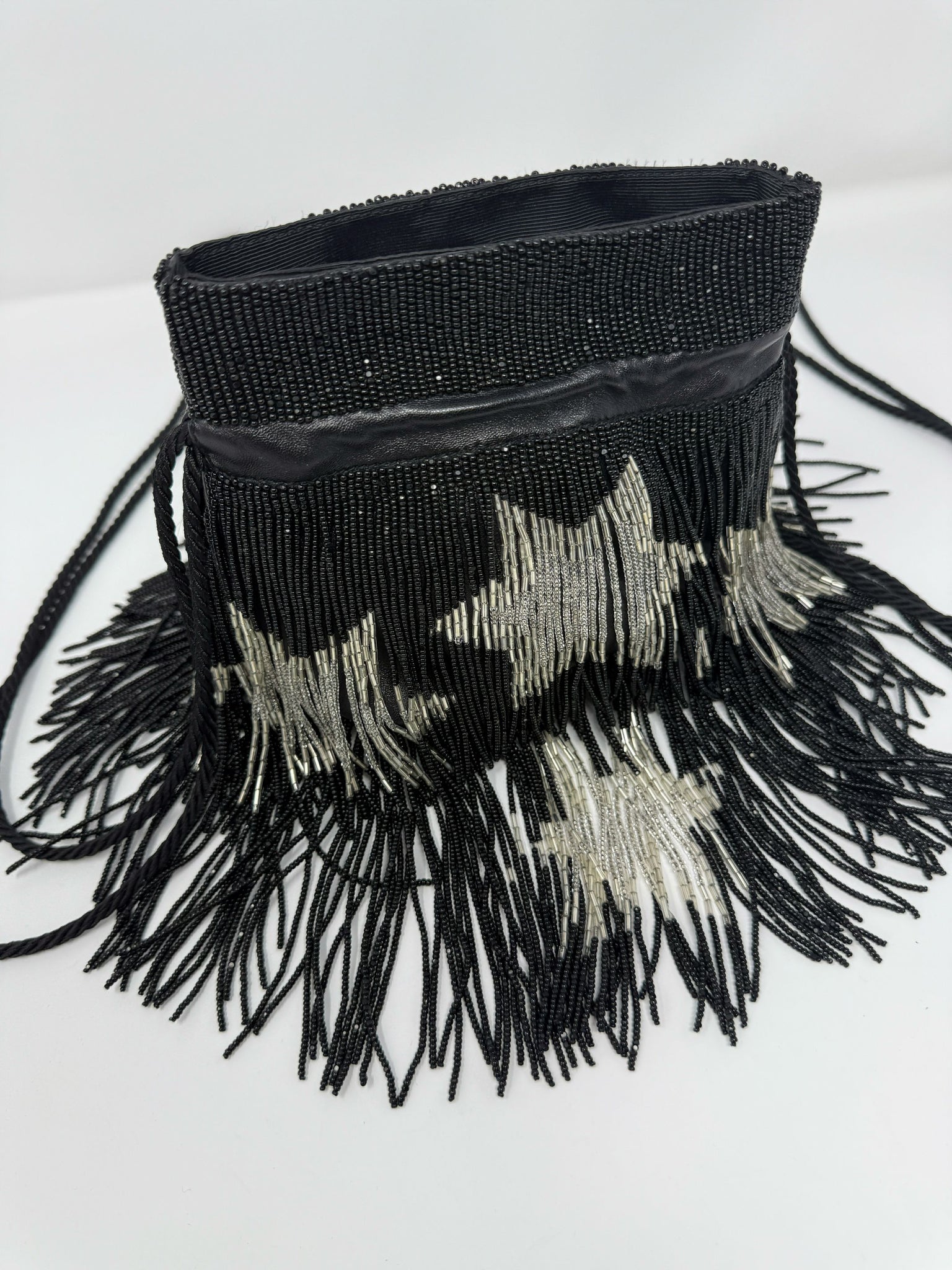 Saint Laurent Black Leather and beaded bucket style evening bag with unique star design and draw string closure. No Dust bag.